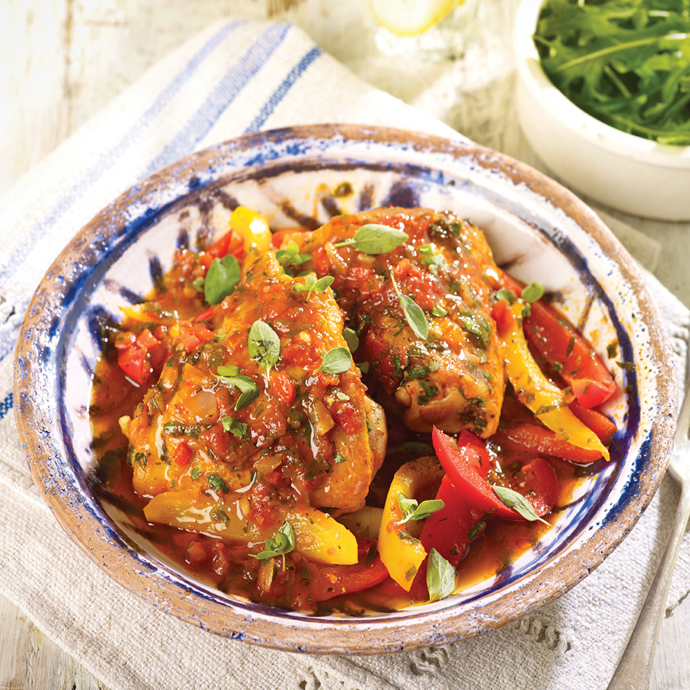 6. Die Schältomaten, das geröstete Hähnchen, die Hühnerbrühe und Kräuter hinzugeben. Mit Salz und schwarzem Pfeffer abschmecken